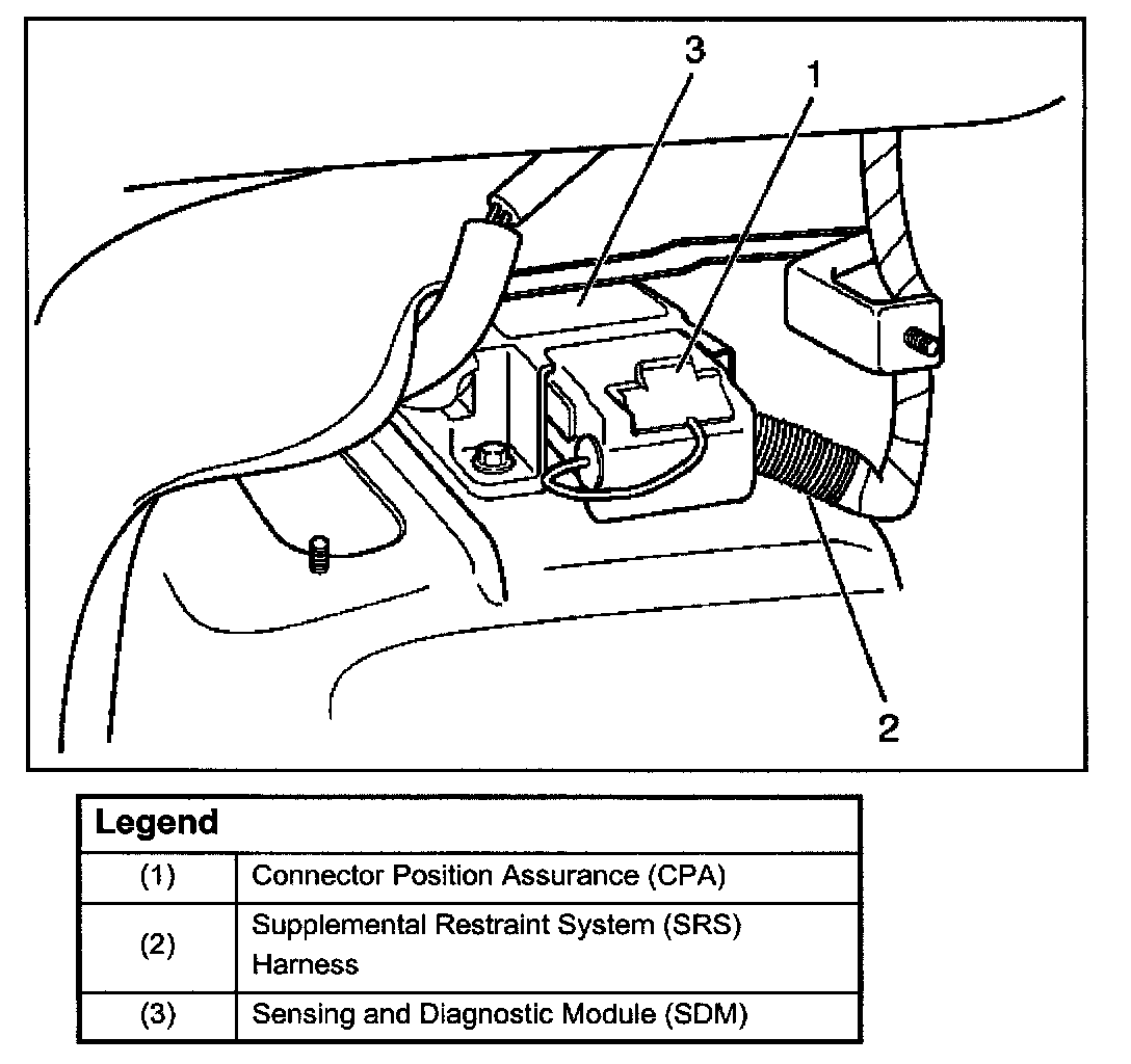 The SDM is connected to the SRS wiring harness by a 24-pin connector. This harness connector uses a shorting clip across certain terminals in the contact area. This shorting clip connects the "AIR BAG" warning lamp to ground when the SDM harness connector is disconnected or Connector Position Assurance (CPA) is not inserted even if completely connected. This will cause the "AIR BAG" warning lamp to come "ON" steady whenever the ignition switch is at the ON or START positions with the SDM disconnected.