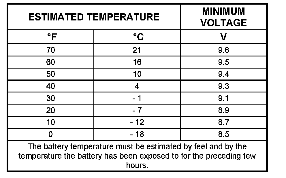 a. VOLTAGE DOES NOT DROP BELOW THE MINIMUM LISTED IN THE TABLE - The battery is good and should be returned to service.