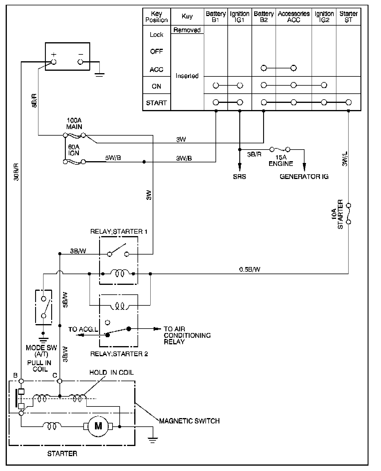 Battery voltage is applied at all times from the positive battery terminal to the starter switch and the normally open starter solenoid contacts. When the starter switch is turned to START and the Anti-theft system is deactivated, and with the automatic transmission mode switch closed, battery voltage is applied to the starter relay coil. The starter relay energizes and applies battery voltage to the starter solenoid coils. The starter solenoid coils energize, the starter solenoid contact closes, and battery voltage is applied to the starter motor The starter motor engages to start the engine.