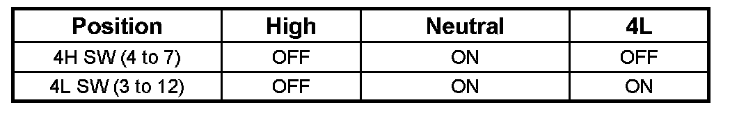 4H and 4L SWITCHCheck whether the 4H (terminals 4 and 7) and 4L switch (terminals 12 and 3) work as specified in the table below. If yes, the continuity is established on these switch. If not, check the switch, shift rails, transfer case, and rear cover, and replace the failed parts.