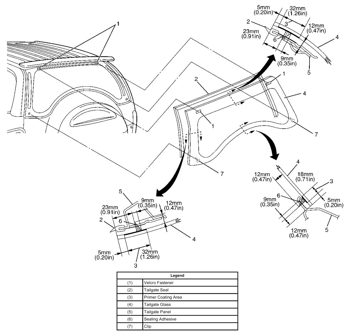 2. Apply primer (sun star #435 - 40 or equivalent) to the tailgate glass side bonding surface as shown in the figure.