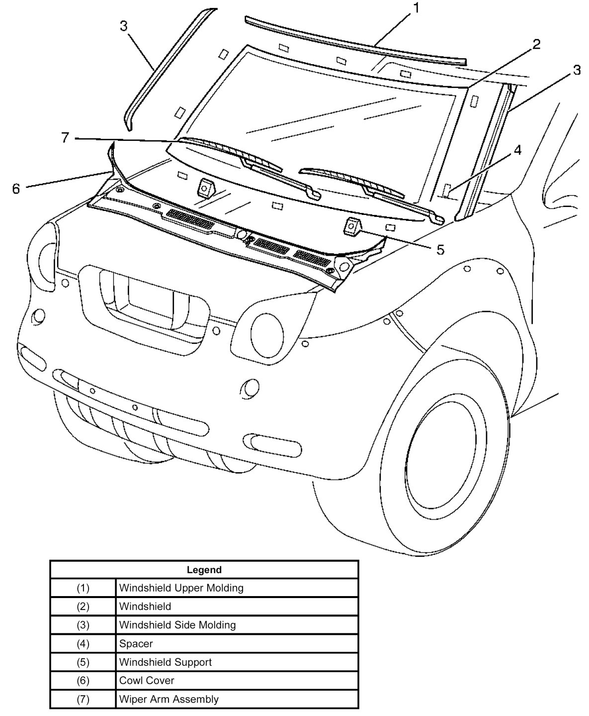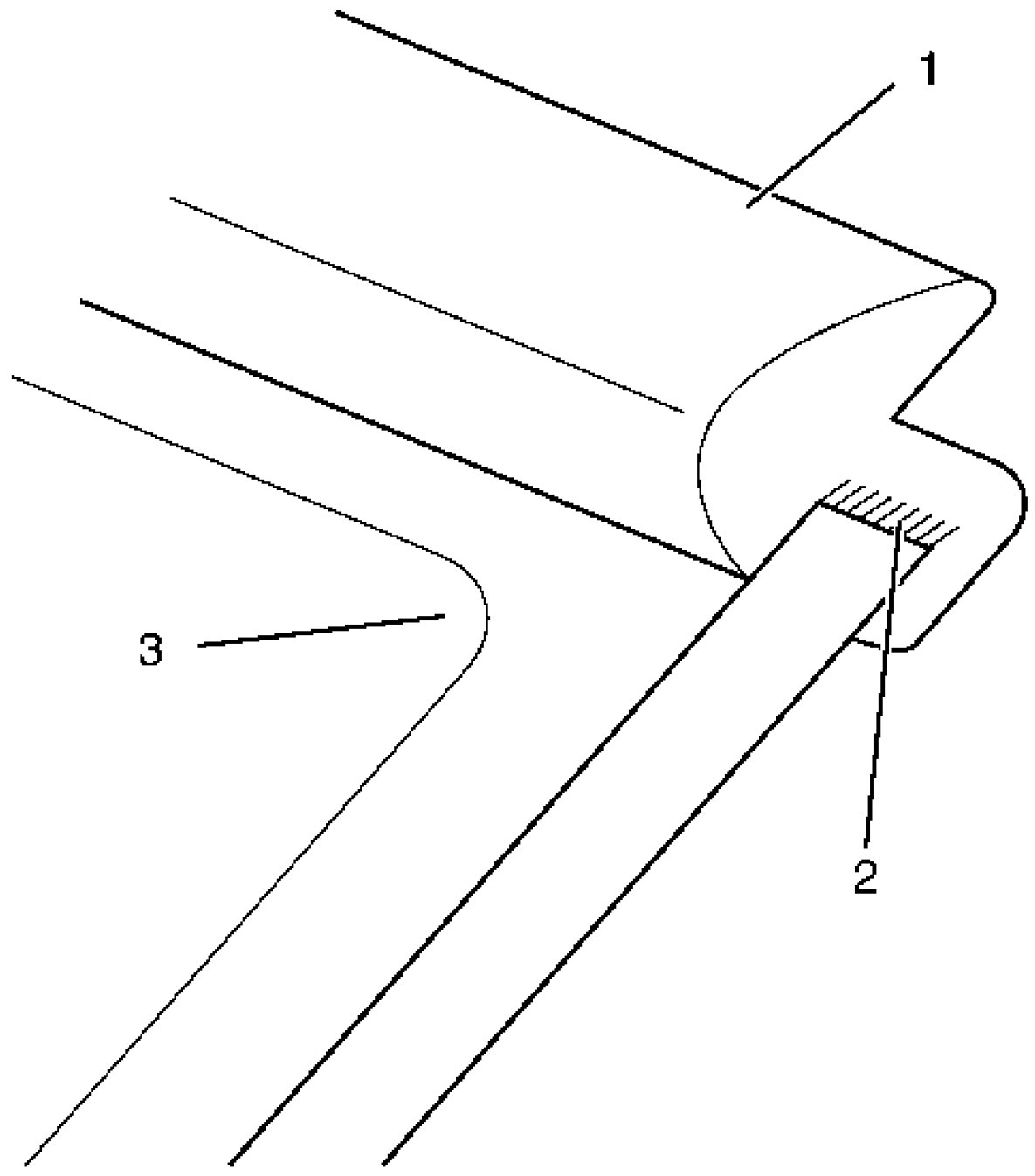 - Peel off the adhesive tape (2) from the windshield upper molding, and start applying it with one end of the glass (3) and cut away the surplus at the other end of the glass for length adjustment.