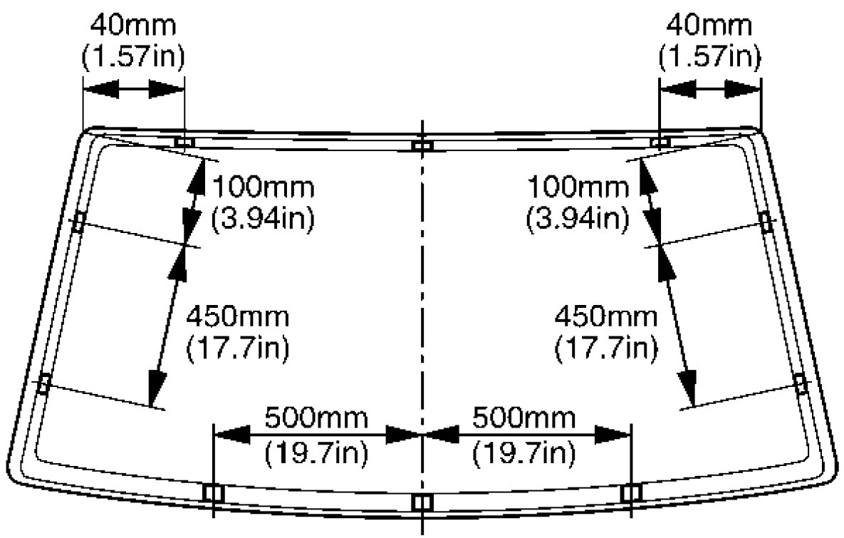 - After drying primer completely, apply a sealing adhesive (1) (Sun star #555 or equivalent) along the edge of the glass so that the sealing adhesive has a 20 mm (0.79 in) junction at middle of the base of the glass.
