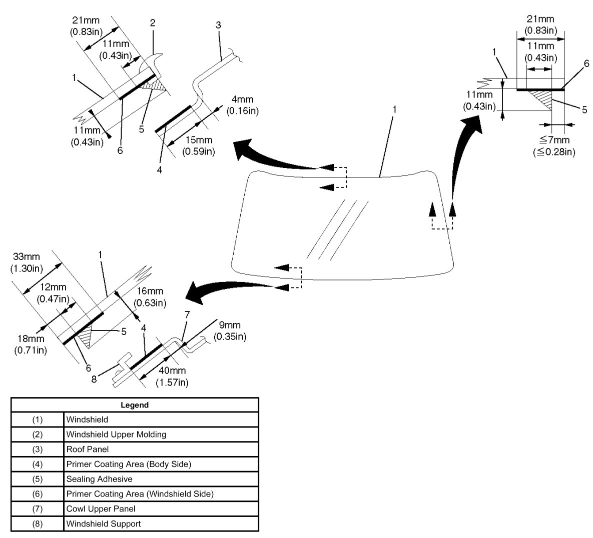 - Apply primer (6) (Sun star #435-40 or equivalent) to the windshield side bonding surface as shown in the figure.