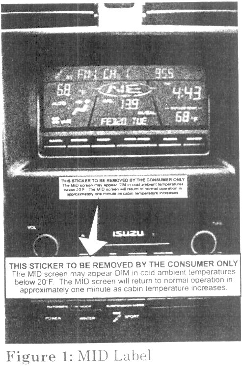 This dim condition at low ambient temperature is a characteristic for this type of liquid crystal display. No repairs should be attempted. This sticker should not be removed during In-Depth delivery or PDI. The customer should be made aware that this is a normal function of the MID display screen.