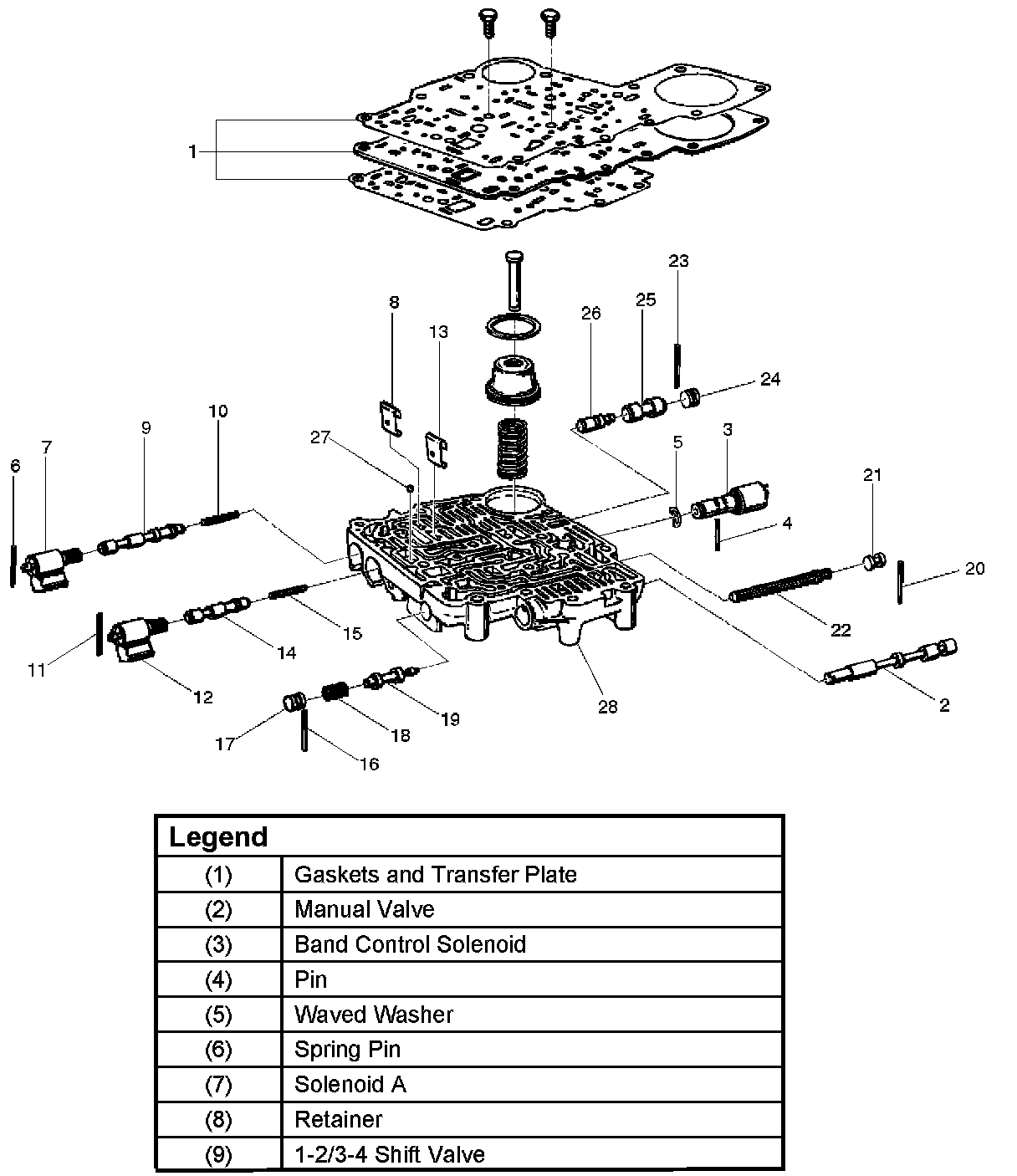 4. Remove band control solenoid (3) and waved washer (5).