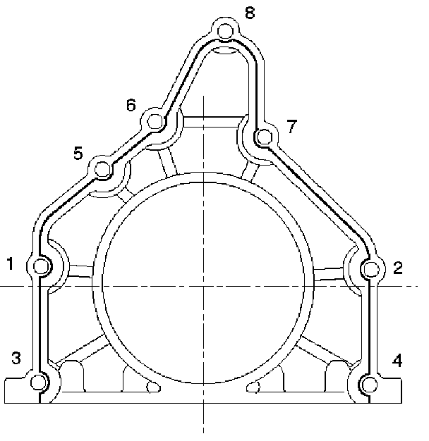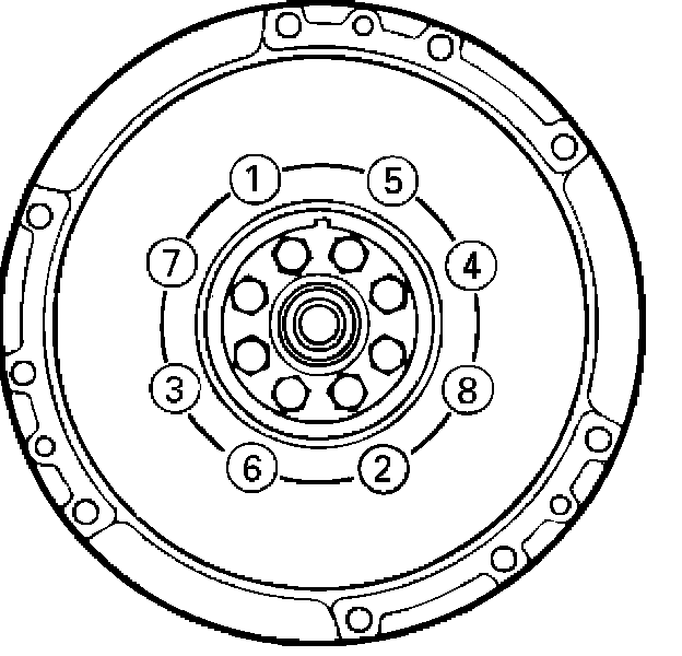 4. Holding the crankshaft stationary, tighten the flywheel bolts in the order shown.