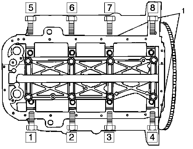 7. Install cylinder block side bolts (1) and tighten crankcase bolts in sequence shown in the illustration.