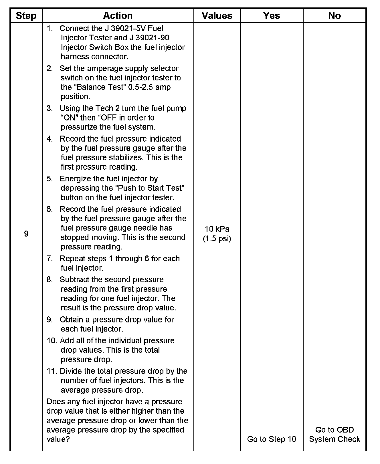 7. The Fuel Injector Balance Test portion of this chart (Step 7 through Step 11) checks the mechanical (fuel delivery) portion of the fuel injector. An engine cool-down period of 10 minutes is necessary in order to avoid irregular fuel pressure readings due to "Hot Soak" fuel boiling.