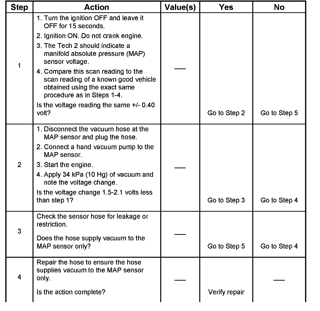2. Applying 34 kPa (10 Hg) vacuum to the MAP sensor should cause the voltage to be 1.5-2.1 volts less than the voltage at step 1. Upon applying vacuum to the sensor, the change in voltage should be instantaneous. A slow voltage change indicates a faulty sensor.