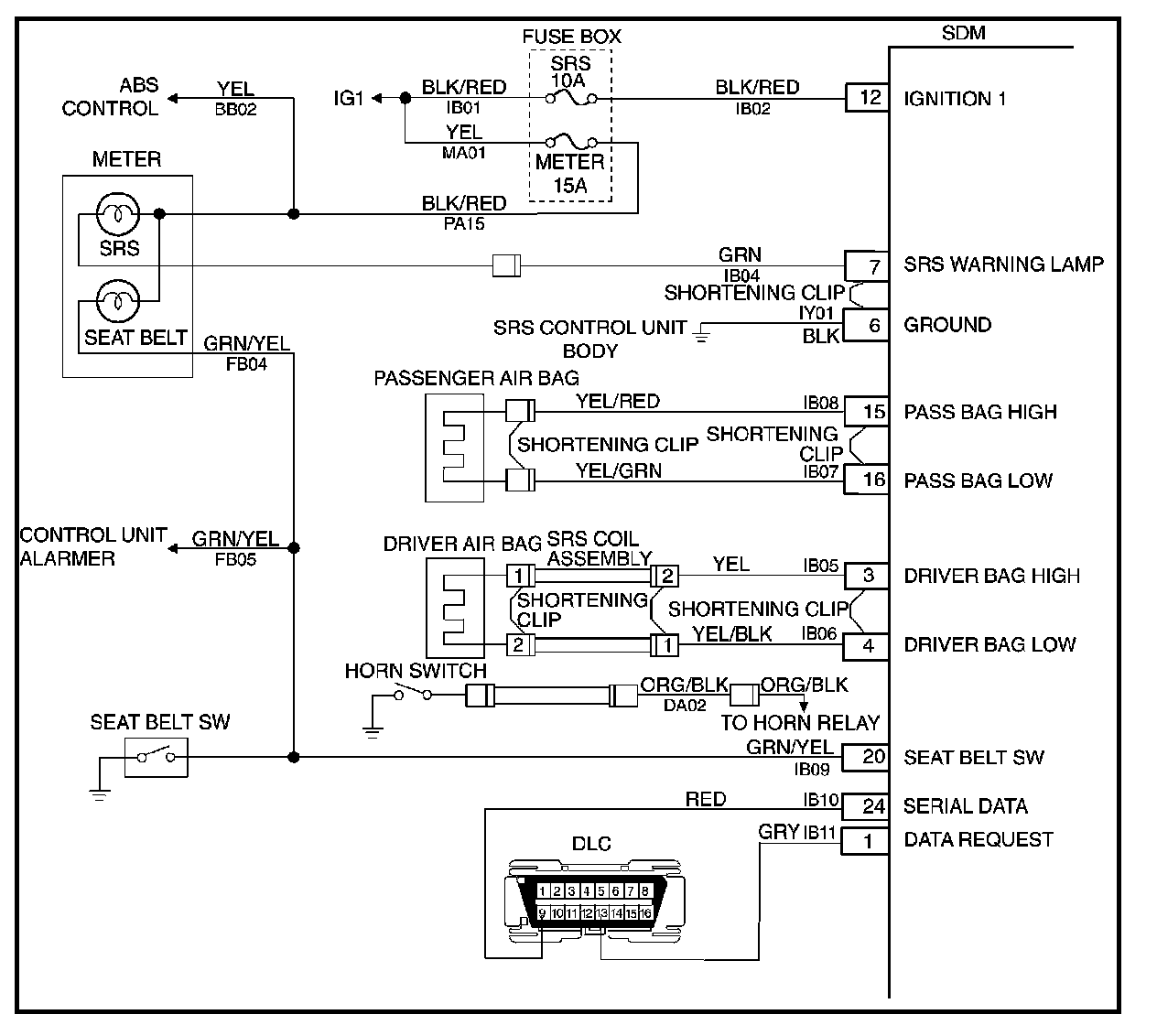 The SRS consists of the Sensing and Diagnostic Module (SDM), the driver air bag assembly, the SRS coil assembly, the passenger air bag assembly, and the "AIR BAG" warning lamp in the instrument cluster. The SDM, SRS coil assembly (driver side only), driver air bag assembly, passenger air bag assembly and connector wire make up the deployment loops. The function of the deployment loops is to supply current through air bag assembly, which will cause deployment of the air bags in the event of a frontal crash of sufficient force, up to 30 degrees off the centerline of the vehicle. The air bag assemblies are only supplied enough current to deploy when the SDM detects vehicle velocity changes severe enough to warrant deployment.