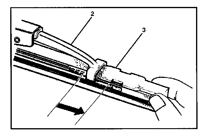 Removal1. Push the wiper blade lock (1) while pulling the wiper blade in the arrow direction as shown in the figure.