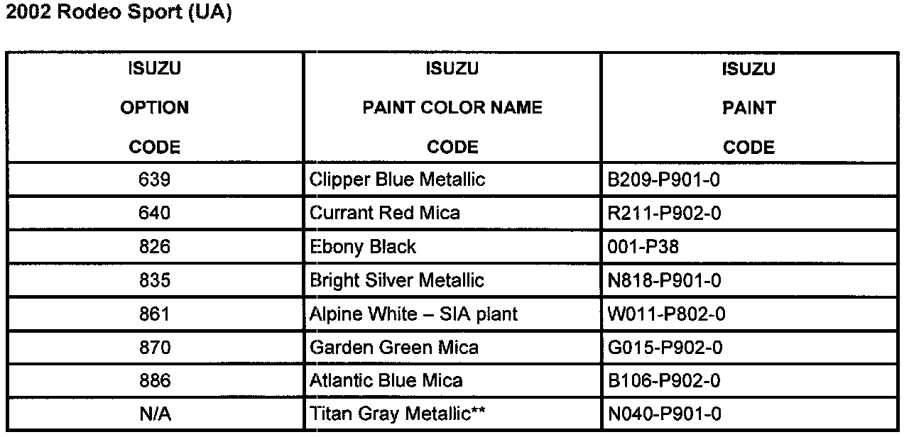 **Trim color for Rodeo S and Rodeo Sport Bumper Fascias and available overfenders. Also, trim color for all Rodeo Sport SE appearance package (bumpers, moldings, and hybrid tire cover).