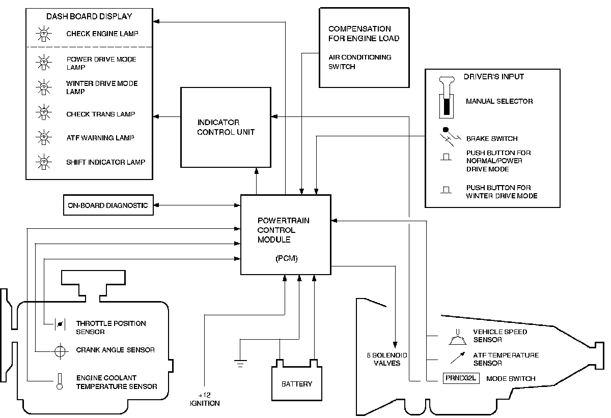 If a major system failure occurs which could affect safety or damage the transmission under normal vehicle operation, the diagnostic system detects the fault and overrides the Powertrain Control Module (PCM)