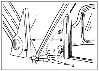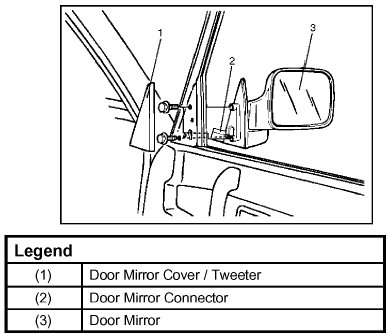 - Remove the connectors(2) and the door mirror cover, if equipped with a tweeter.