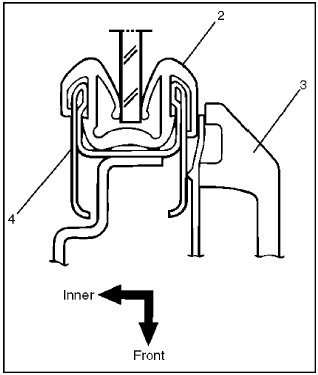 2. When installing the door mirror, hold the glass run lip(2) between the door mirror base(3) and the center sash(4).