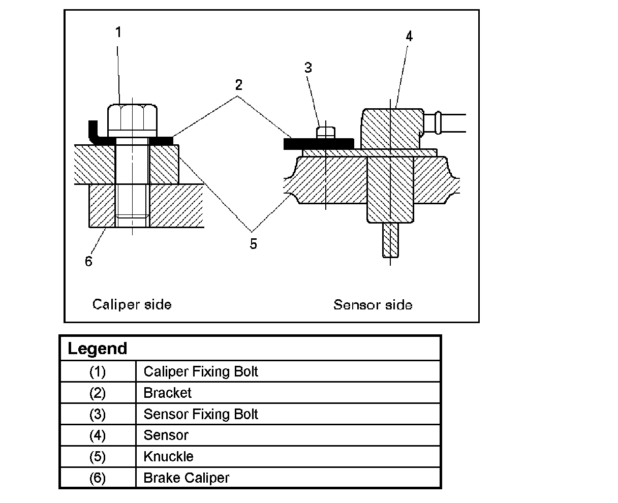 4) Remove the speed sensor cable fixing bolts (1) and caliper fixing bolt (2) from caliper side speed sensor cable bracket (3).