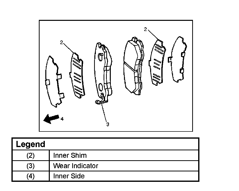 Note: If a squealing noise occurs from the front brake while driving, check the pad wear indicator plate. If the indicator plate contacts the rotor, the disc pad assembly should be replaced.