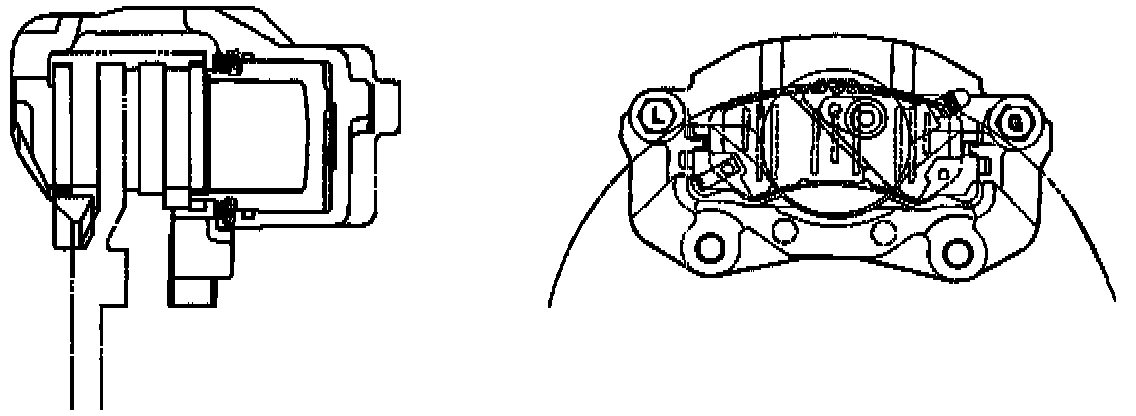 Disc BrakeThe disc brake assembly consists of a caliper, piston, rotor, pad assembly and support bracket. The caliper assembly has a single bore and is mounted to the support bracket with two mounting bolts. The support bracket allows the caliper to move laterally against the rotor. The caliper is a one- piece casting with the inboard side containing the piston bore. A square cut rubber seal is located in a groove in the piston bore, which provides the hydraulic seal between the piston and the cylinder wall.