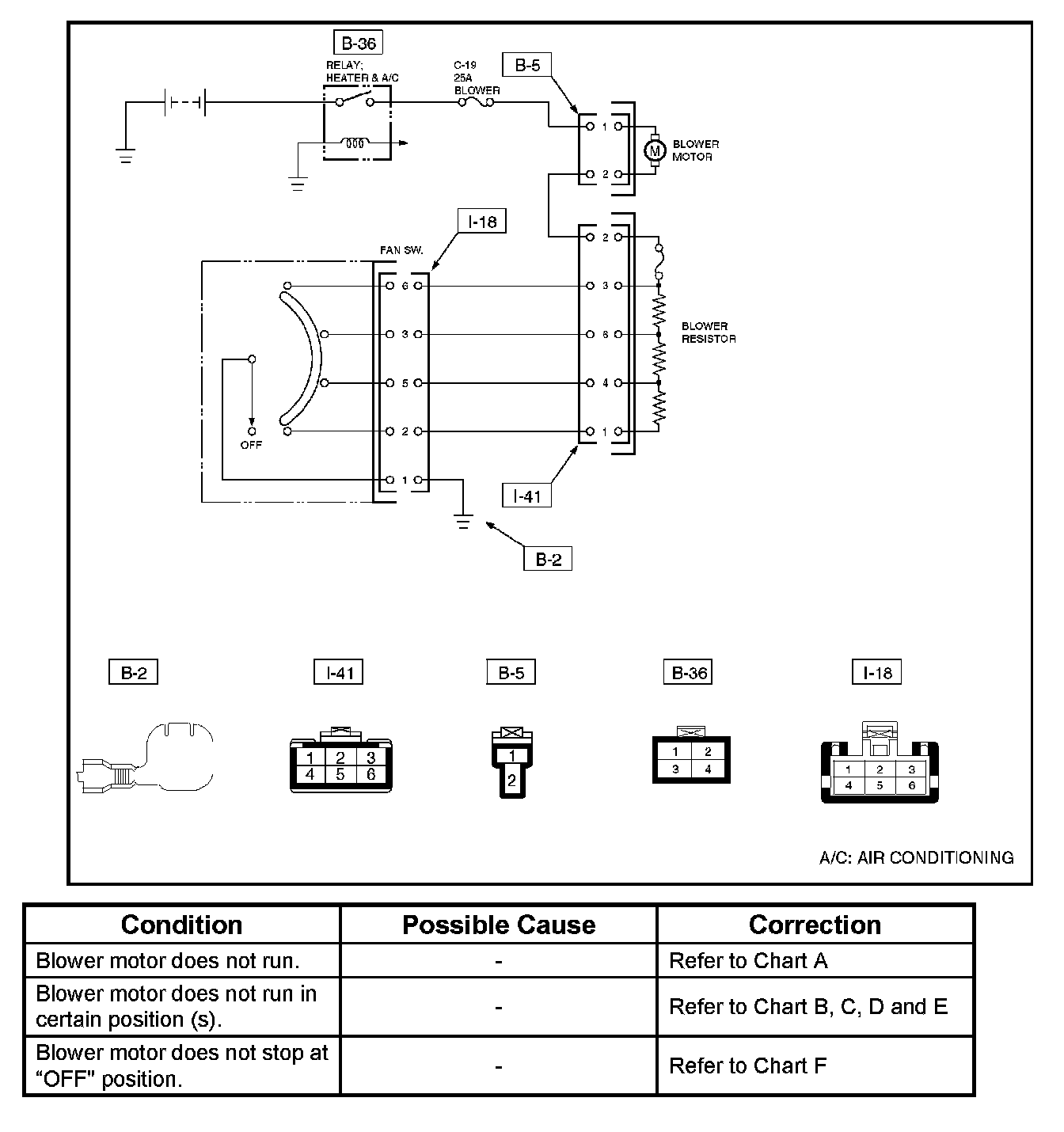 Fan Control Lever (Fan Switch) DiagnosisCurrent flows to the blower motor through the heater and the A/C relay (B-36) to activate the rotation of the blower motor by turning "ON" the fan control knob (fan switch). Blower motor speed is controlled in stages by the resistor, by operating the switch from "BLOW" to "HIGH".