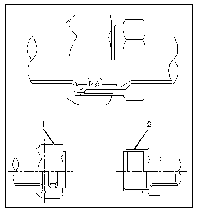 O-rings (2) must be closely aligned with the raised portion (1) of refrigerant line.