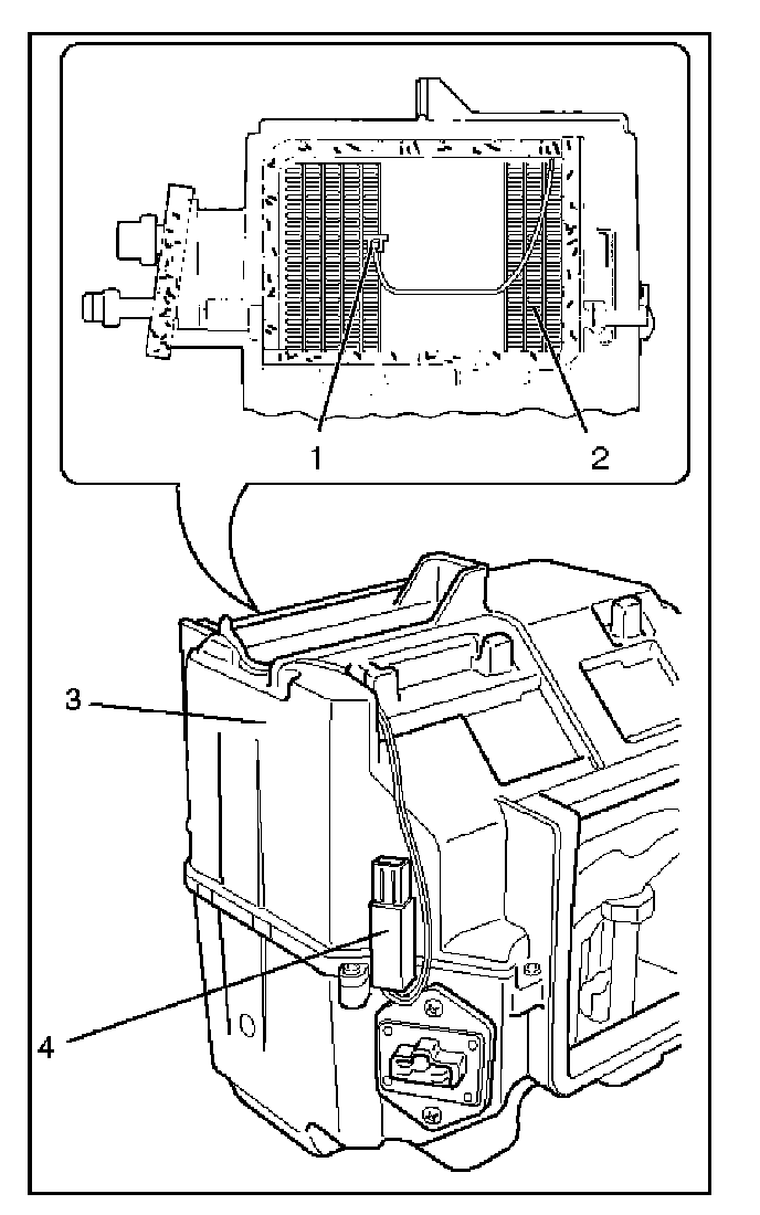 The evaporator cools and dehumidifies the air before the air enters the passenger compartment. High-pressure liquid refrigerant flows through the expansion valve (2) into the low-pressure area of the evaporator. The heat in the air passing through the evaporator core (1) is lost to the cooler surface of the core, thereby cooling the air.
