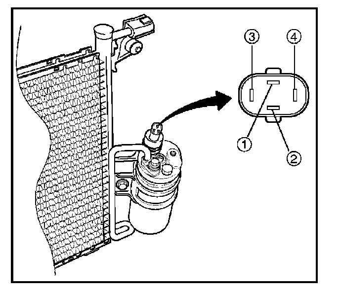 Pressure Switch1. Disconnect pressure switch connector and check for continuity between pressure switch side connector terminals (1) and (2).