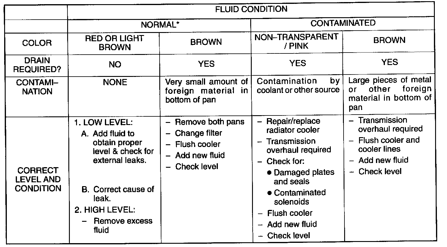 Checking fluid level and condition (color and odor) at regular intervals will provide early diagnosis information about the transmission. This information may be used to correct a condition that, if not detected early, could result in major transmission repairs.