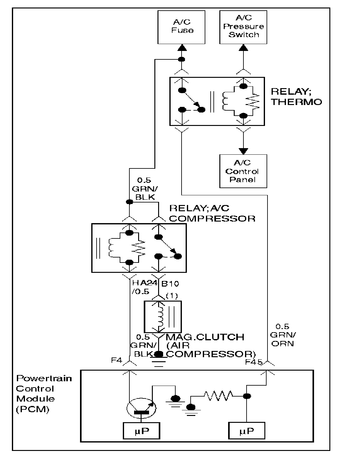 When air conditioning and blower fan are selected, and if the system has a sufficient refrigerant charge, a 12-volt signal is supplied to the A/C request input of the powertrain control module (PCM). The A/C request signal may be temporarily canceled during system operation by the electronic thermostat in the evaporator case. When the A/C request signal is received by the PCM, the PCM supplies a ground from the compressor clutch relay if the engine operating conditions are within acceptable ranges. With the A/C compressor relay energized, voltage is supplied to the compressor clutch coil.