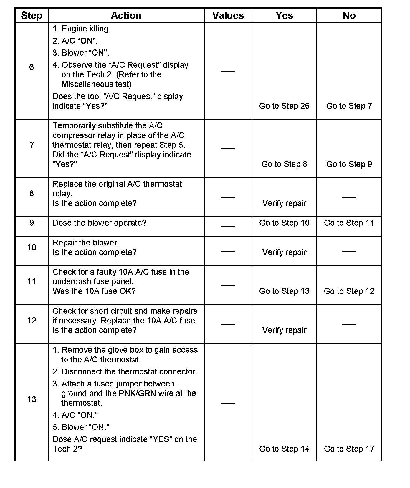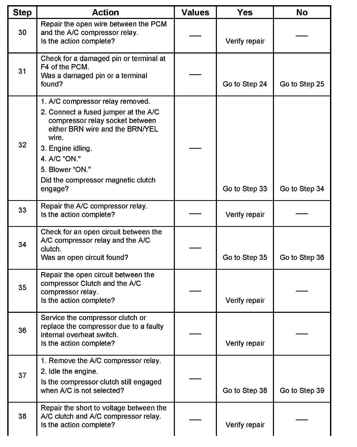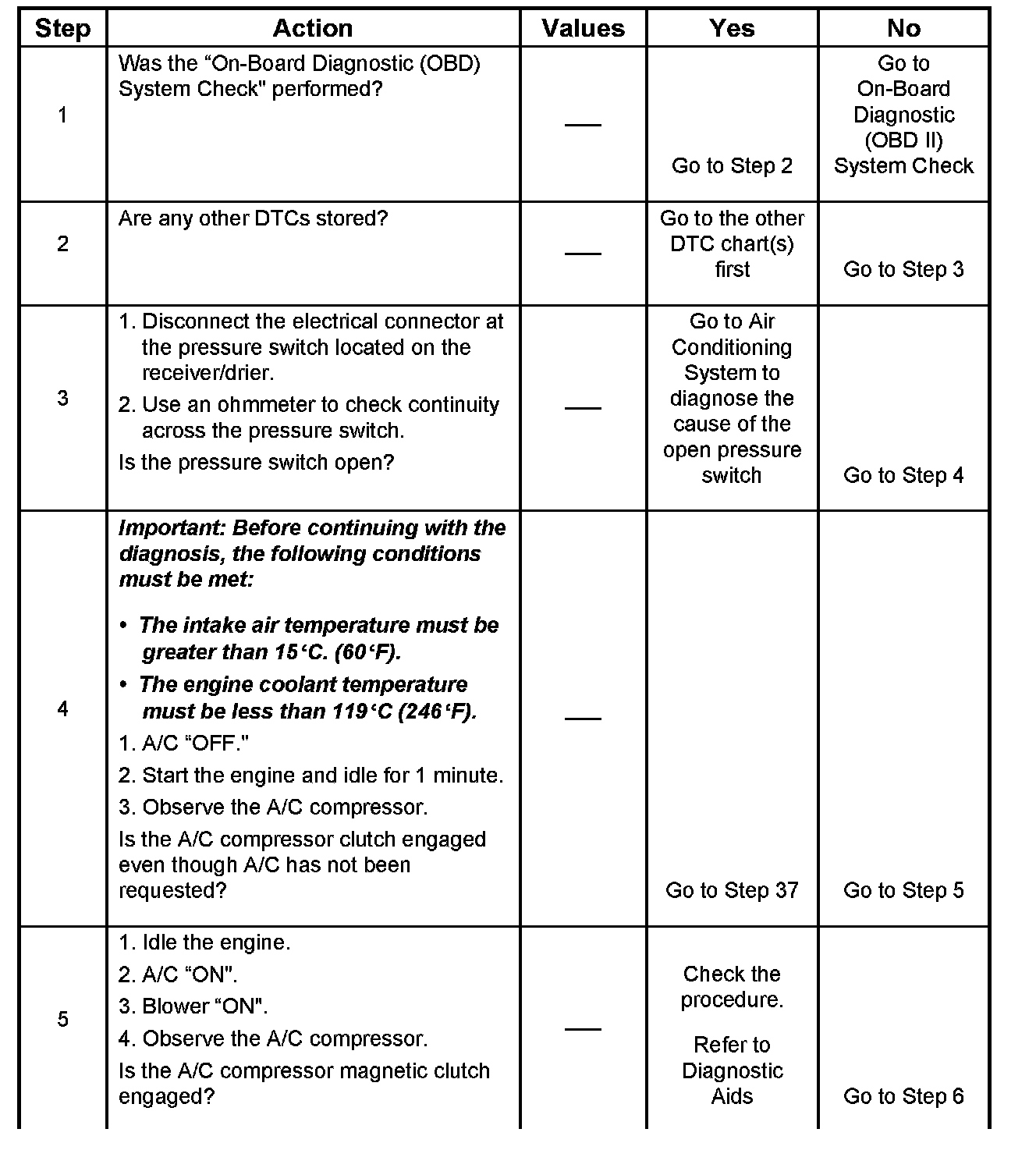 4. Although the normal complaint will be the A/C clutch failing to engage, it is possible for a short circuit to cause the clutch to run when A/C has not been selected. This step is a test for that condition.