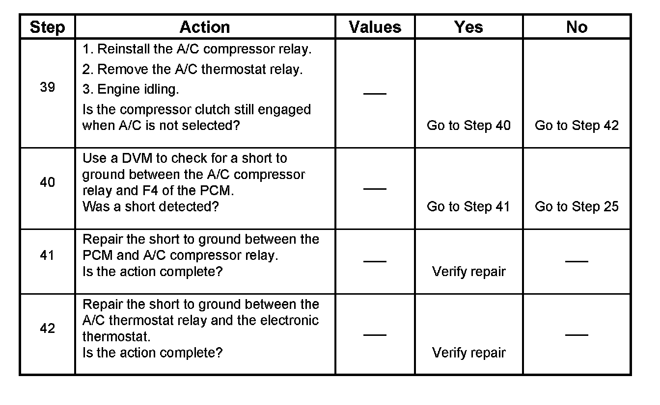 This chart should be used for diagnosing the electrical portion of the A/C compressor clutch circuit. A Tech 2 will be used in diagnosing the system. The Tech 2 has the ability to read the A/C request input to the PCM. The Tech 2 can display when the PCM has commanded the A/C clutch "ON." The Tech 2 should have the ability to override the A/C request signal and energize the A/C compressor relay.