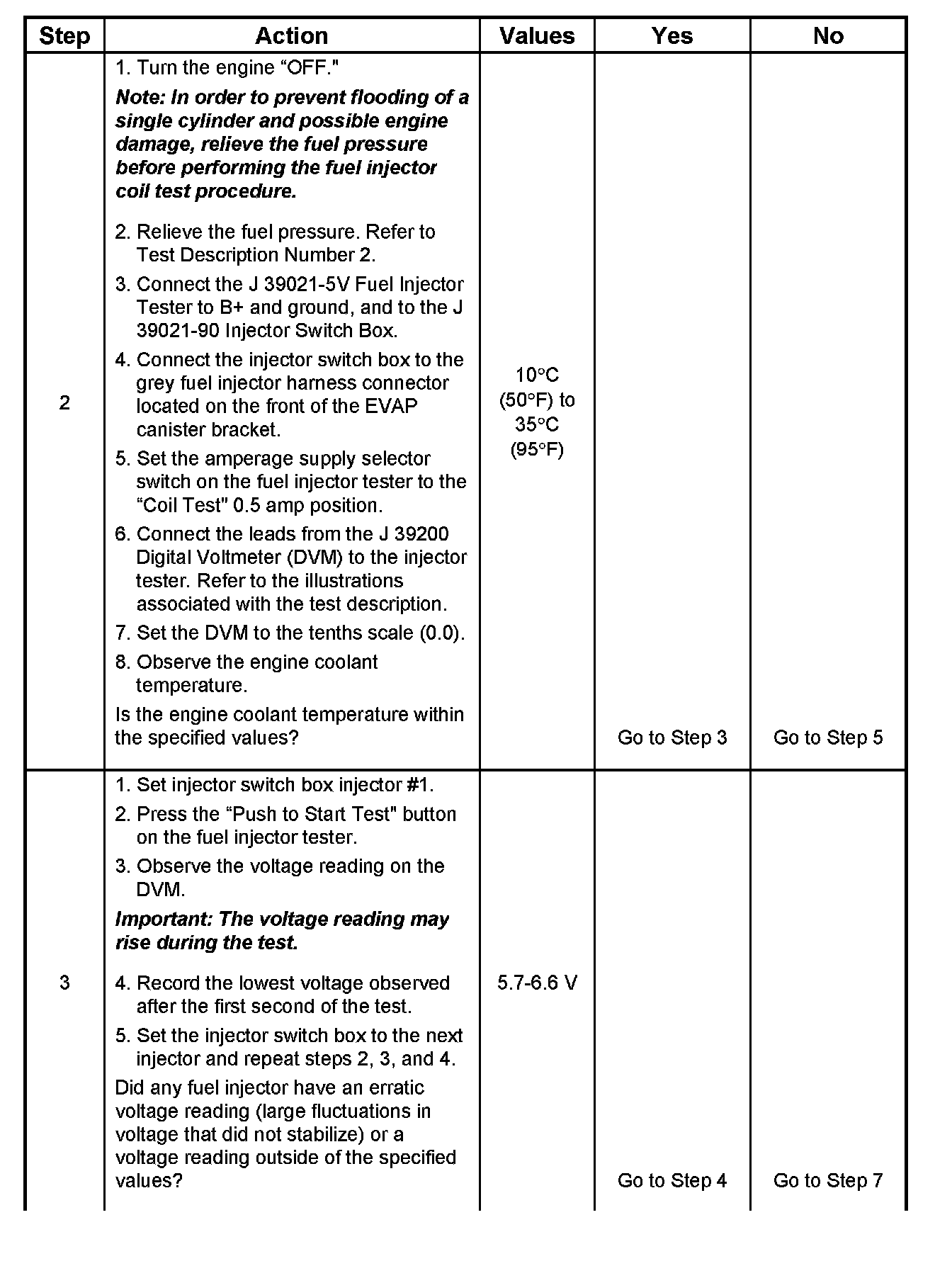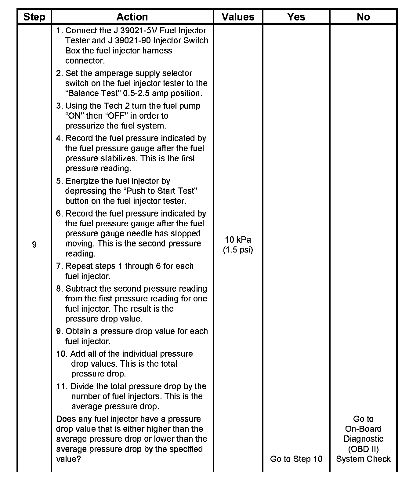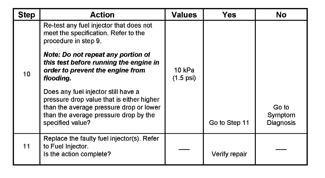 7. The Fuel Injector Balance Test portion of this chart (Step 7 through Step 11) checks the mechanical (fuel delivery) portion of the fuel injector. An engine cool-down period of 10 minutes is necessary in order to avoid irregular fuel pressure readings due to "Hot Soak" fuel boiling.