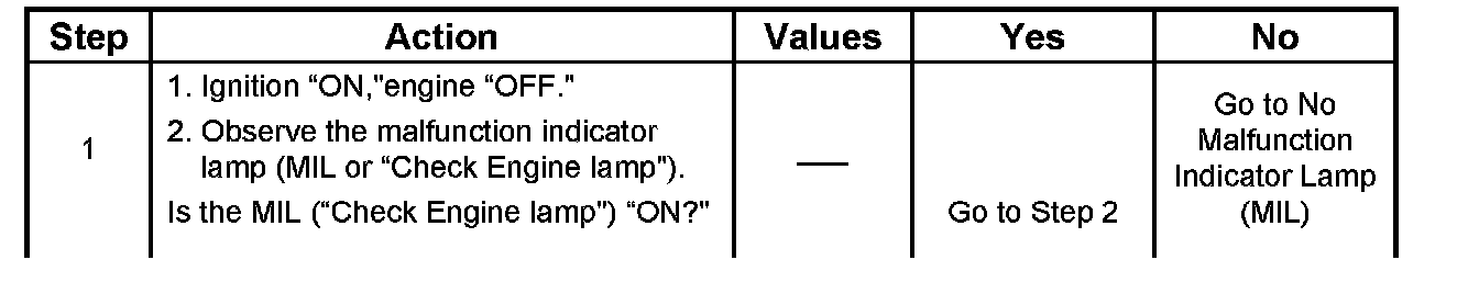 1. The MIL ("Check Engine lamp") should be "ON" steady with the ignition "ON "engine "OFF." If not, the "No MIL" chart should be used to isolate the malfunction.