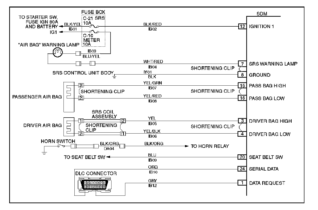 When the SDM recognizes "Ignition 1" voltage, applied to terminals "12", is greater than 9 volts, the "AIR BAG" warning lamp is flashed 7 times to verify operation. At this time the SDM performs "Turn- ON" tests followed by "Continuous Monitoring" tests. When a malfunction is detected, the SDM sets a current diagnostic trouble code and illuminates the "AIR BAG" warning lamp. The SDM will clear current diagnostic trouble codes and move them to a history file when the malfunction is no longer detected and/or the ignition switch is cycled, except for DTCs 19, 25, 51, 53 and 71. DTC 71 can only be cleared using a scan tool "Clear Codes" command. If DTCs 51, 53 are not indicated then DTC 71 is not existing. DTCs 51, 53 and 71 can not be cleared after a "Clear Codes" command is issued.
