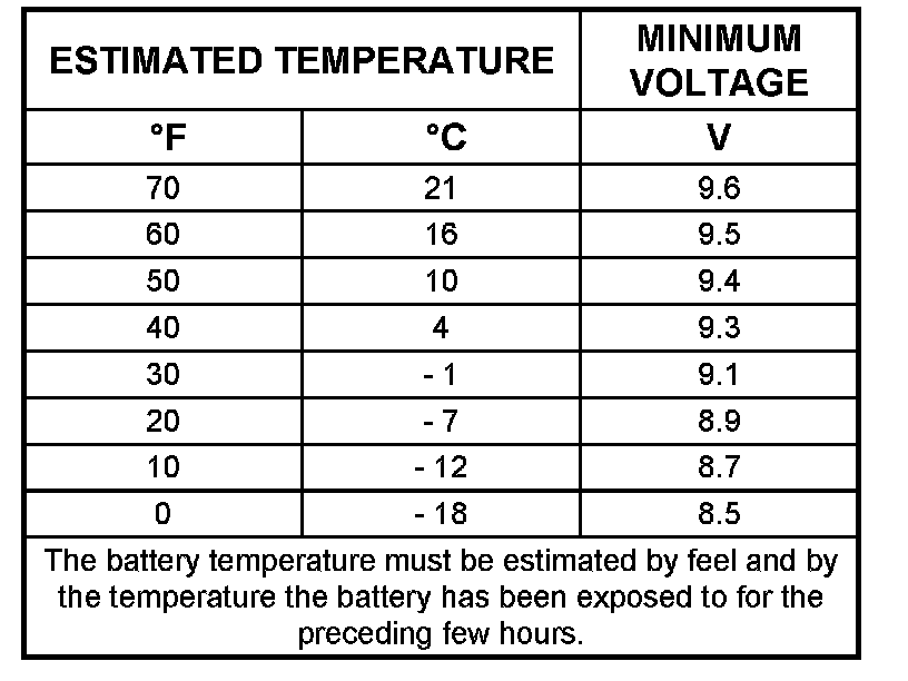 a. VOLTAGE DOES NOT DROP BELOW THE MINIMUM LISTED IN THE TABLE - The battery is good and should be returned to service.