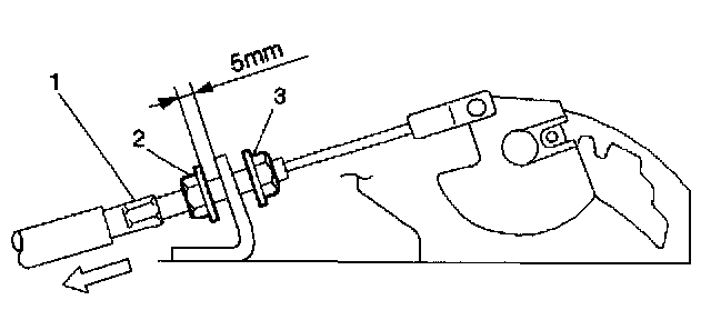b. With cable kept as (a), adjust gap between nut (2) and bracket to 5 mm (0.2 inch).