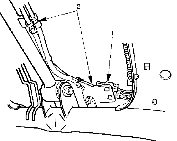 8. Disconnect the ABS connectors (1) and remove the brackets (2) attached to the frame and center link.
