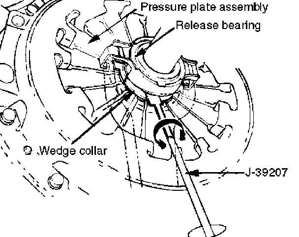 27. Use the clutch release bearing remover J-39207 to disconnect the clutch release bearing from the clutch pressure plate.