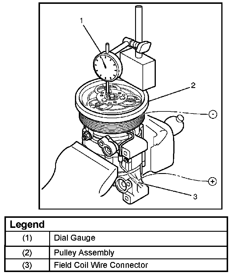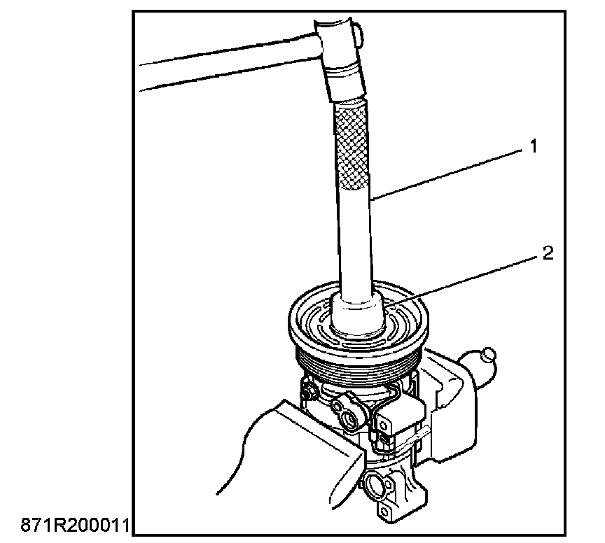 5. Remove pulley assembly by using pulley puller pilot J-38424 (2), pulley puller J-8433 (1) and pulley puller leg J-24092-2 (3).