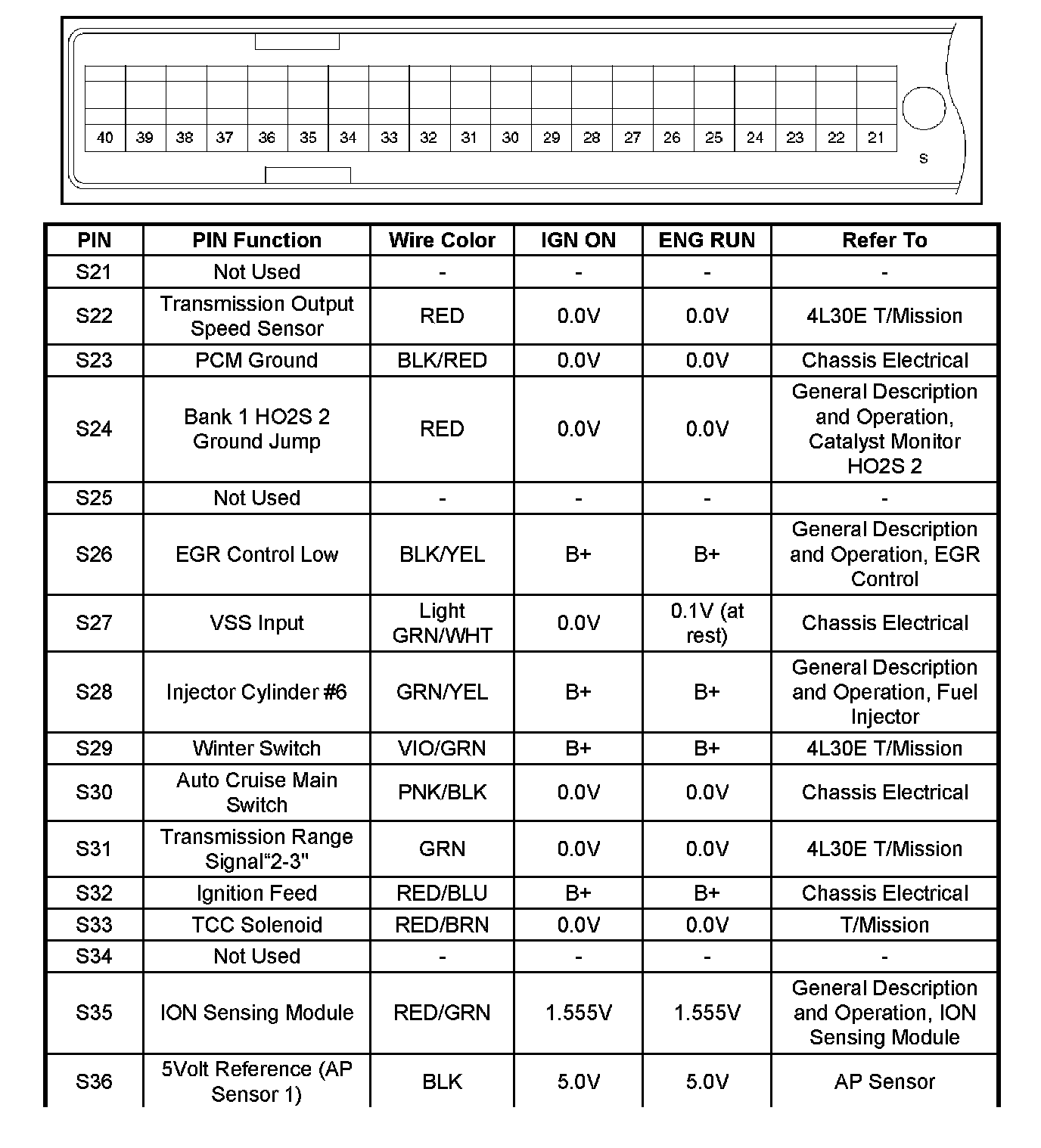PCM Pinout Table, 80-Way Red Connector - Row "S21 - 40" Part - 2: