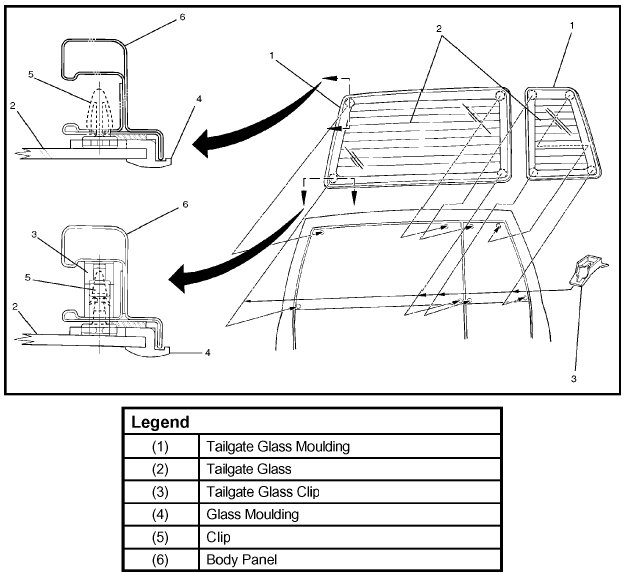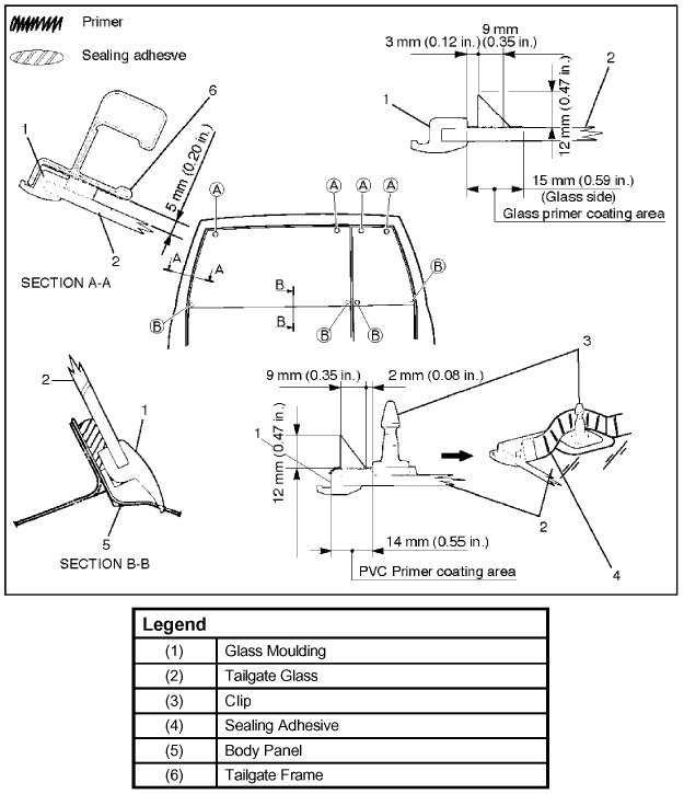 - Be absolutely sure to apply glass primer to the tailgate glass and PCV primer to the glass moulding (1).