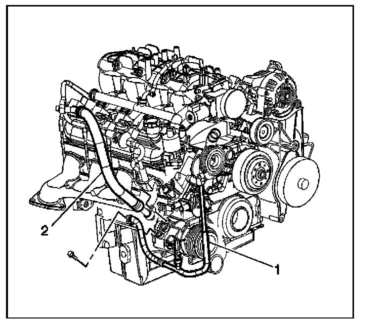 8. Remove the compressor hose mounting nut (2) from the A/C compressor.