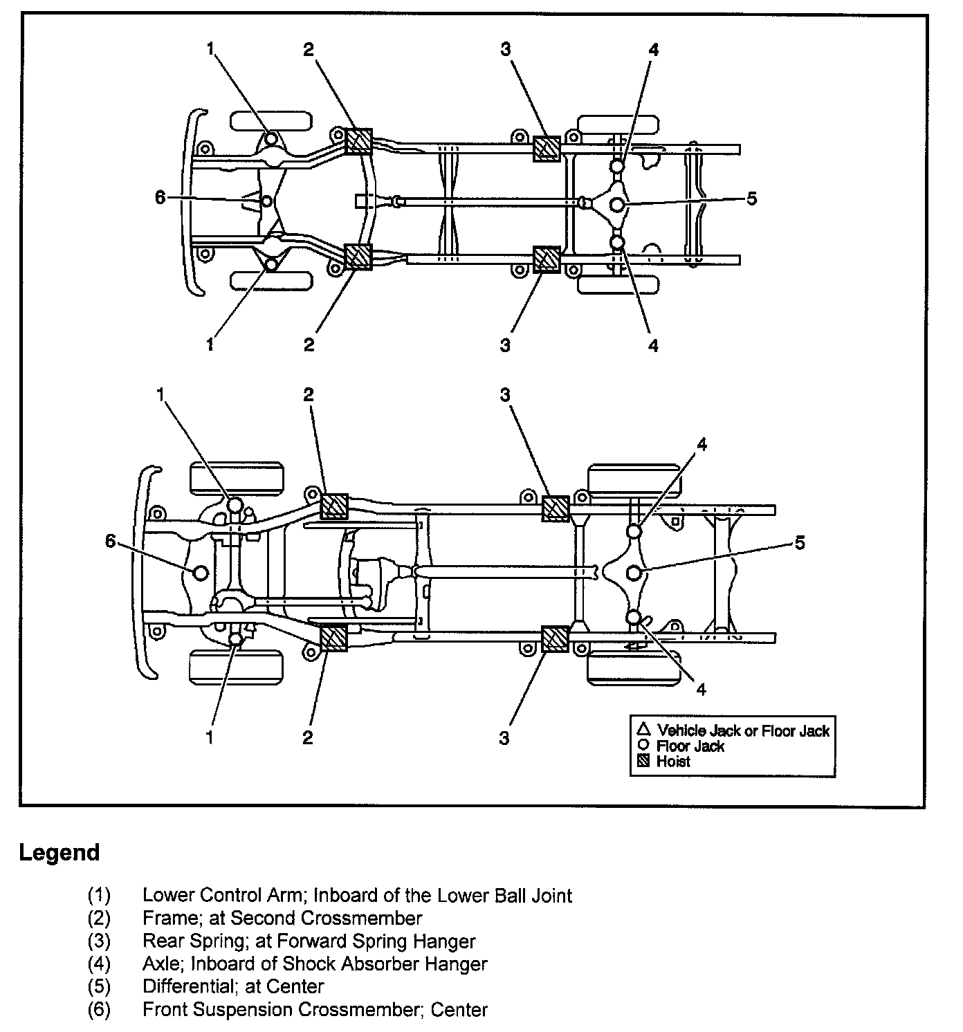 - To avoid any vehicle damage, serious personal injury or death when major components are removed from the vehicle and the vehicle is supported by a hoist, support the vehicle with jack stands at the opposite end from which the components are being removed.