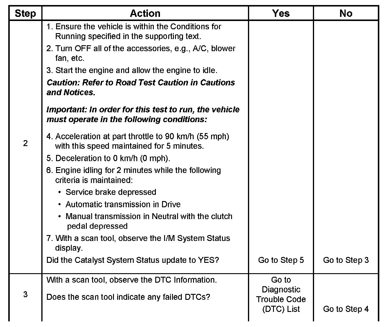 The purpose of this test is to satisfy the enable criteria necessary to execute I/M readiness diagnostics for the catalyst system. The test may be used to set the I/M System Status indicators to YES. Ensure that the vehicle meets the requirements listed in Conditions for Running before performing this test. Failure to meet the necessary requirements may produce inaccurate test results.