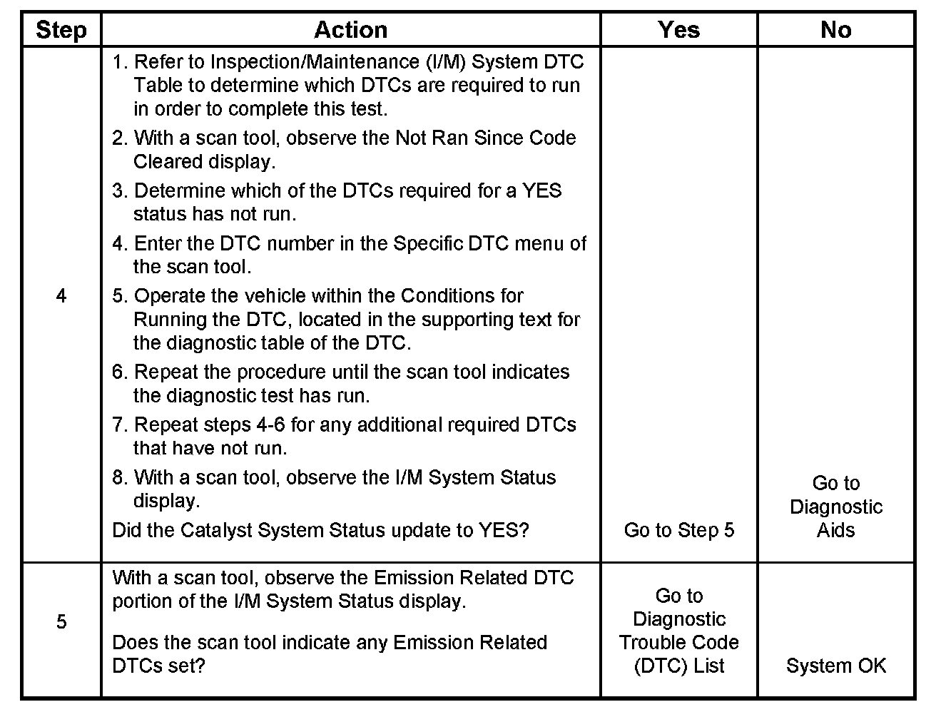 3. This step identifies a first failure of a type B DTC. A DTC only appears on the I/M System Status display when the DTC becomes a MIL illuminating DTC. This occurs on the second failure of a type B DTC. A first failure of a type B DTC will not allow the I/M System Status to update to YES. Refer to Diagnostic Aids.