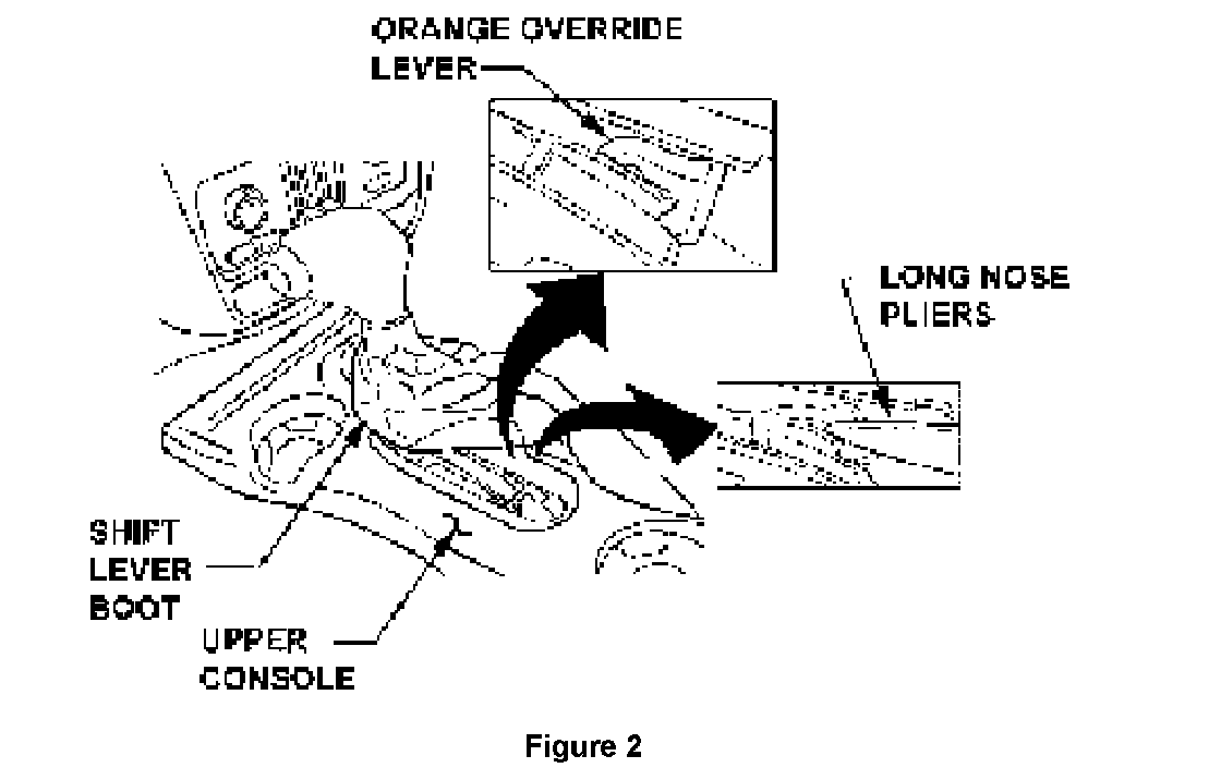 3. Locate the ORANGE override lever on the right side of the transmission shifter assembly (see figure 2).
