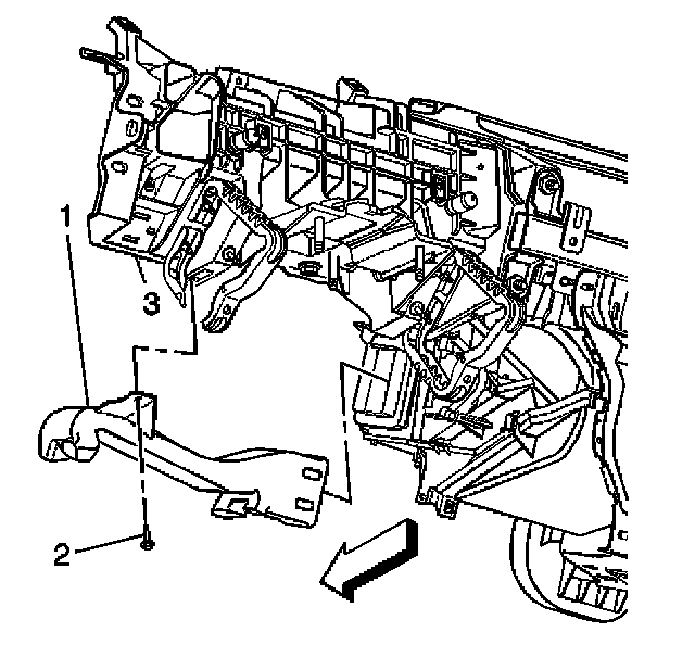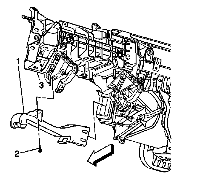7. Remove the retaining screw (2) from the left HVAC floor duct (1).