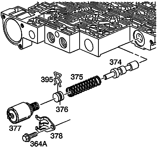 14. Remove the solenoid retainer bolt (364A) and the solenoid retainer (378). Remove the pressure control solenoid (377).