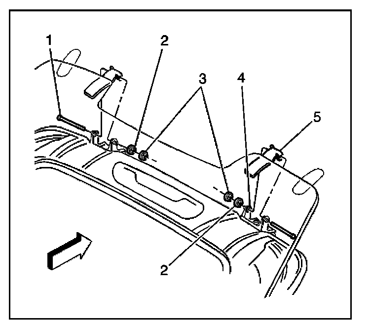 Tighten: Tighten the liftgate window handle bolts (3) to the striker plate to 5 Nm (44 lb in).
