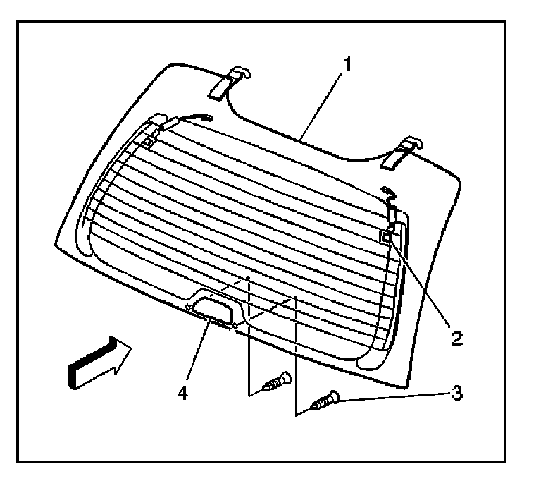 5. Remove the outside handle (4) and striker from the liftgate window.